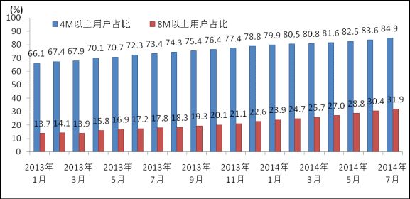 圖3 2013-2014年7月互聯(lián)網(wǎng)寬帶接入速率4M和8M以上用戶占比情況