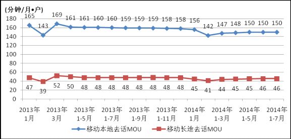 圖5. 2013-2014年各月移動本地和長途去話MOU值比較