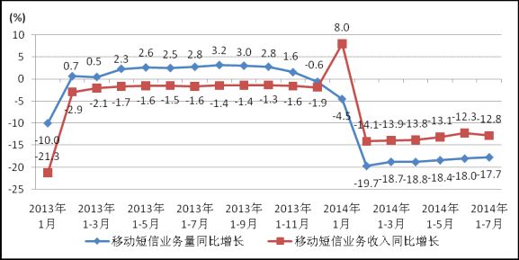 圖6. 2013-2014年各月移動短信業(yè)務量和移動短信收入同比增長情況