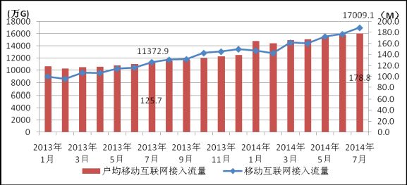 圖7. 2013-2014年各月移動互聯(lián)網(wǎng)接入流量和戶均流量比較