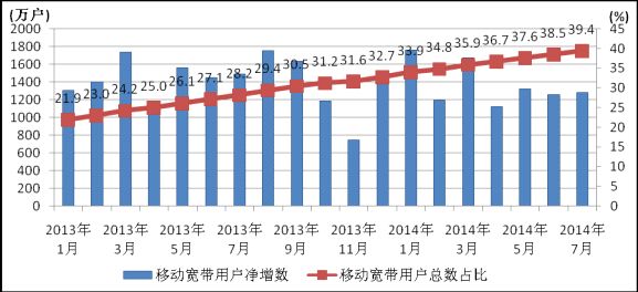 圖2.2013-2014年移動寬帶用戶當月凈增數(shù)和總數(shù)占比情況