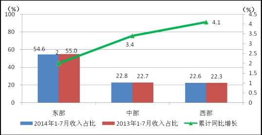 圖10 2014年7月東、中、西部電信業(yè)務收入同期比較
