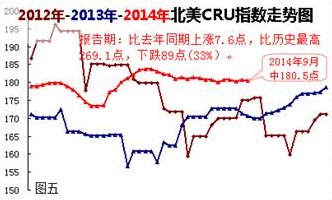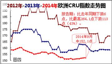 核心提示:2014年9月前半月全球鋼鐵走勢情況分析9月前半月的國際鋼市總體走勢趨弱。月中,159點的CRU總指數月環比下跌1.2%(跌幅擴大)。其中:亞洲指數153.9點,月環比下跌2.8%(跌幅擴大);歐洲指數152.4點,月環比上漲0.4%(漲幅擴大);北美指數180.5%,月環比持平;扁平材指數153.6點,月環比下跌1.3%(跌幅擴大);長材指數171.7點,月環比下跌1.1%(跌幅擴大)。CRU運行態勢顯示,全球鋼市在亞洲及其中國鋼材市場大幅下跌的影響下,再現漲跌互現格局的調整態勢。為此結合基本面情況預測,3季度末或四季度初,全球鋼市將繼續東弱西強的分化走勢,直至中國市場出現觸底反彈為止。(見下圖一、圖二)