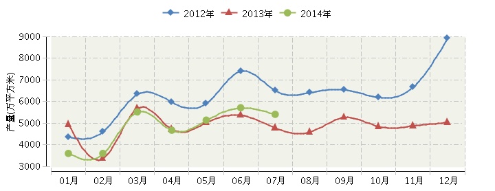 2014年全國輕革行業連續三年月度產量對比