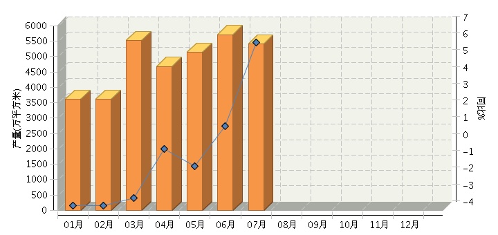 根據國家統計局公布數據,2014年1~7月,全國輕革行業累計完成產量33,464.80萬平方米,同比增長-1.16%。其中:7月份完成產量5410.57萬平方米,同比增長6.01%。2014年月度數據走勢及同比增長情況如下圖所示。