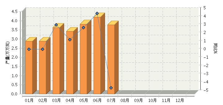 根據國家統計局公布數據,2014年1~7月,全國皮革鞋靴行業累計完成產量25.16萬萬雙,同比增長-7.21%。其中:7月份完成產量3.77萬萬雙,同比增長-4.25%。其中: 7月份完成產量55.21件,同比增長24.85%。2014年月度數據走勢及同比增長情況如下圖所示。