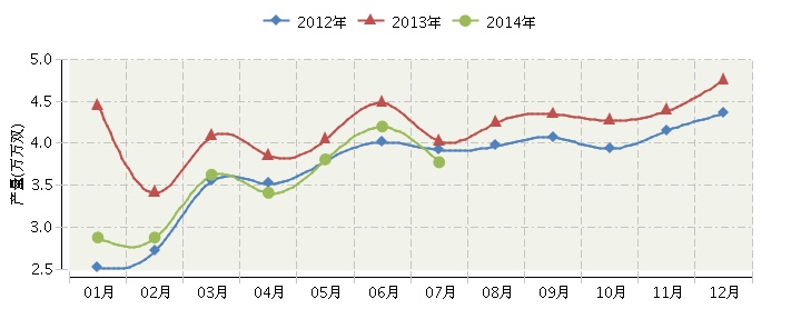 2014年全國皮革鞋靴行業連續三年月度產量對比