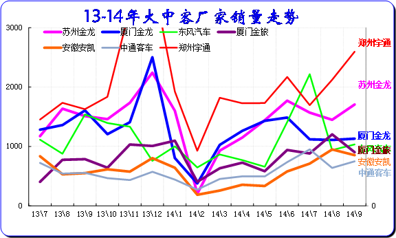 2014年1-9月大中客銷量11.44萬臺,累計增速-2.7%;14.9月銷量1.53萬臺,同比增長8.6%,環比增長13.9%。。由于柴油國四實施的機會促進,13年年末的大客的市場暫時暴增。14年初的大客市場銷售出現季節性下滑。隨著夏秋季到來,旅游和通勤大客的需求走強,而城市公交提升也加速,而9月的新能源車免稅政策也推動9月的新能源客車銷量較大增長。因此宇通、金龍、安凱等表現較強,東風走勢波動較大。