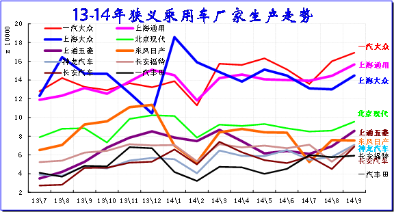 2014年9月的廠家產銷競爭仍是較激烈的,走勢差異性大。上海大眾的14年產量暴增較強,但7-9月開始調整;而一汽大眾今年也在產能發力,成為3-6月產量第一,7月因休假較大,8-9月又是超強。東風日產的年初生產回落較快,隨后努力走穩,但競爭壓力較大。