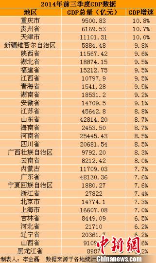 中新網記者根據已公布數據梳理發現,在這29個省份中,重慶前三季度GDP增速最高,為10.8%,貴州以10.7%的增速排名第二,天津(10%)第三,黑龍江(5.2%)墊底。