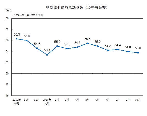 核心提示:2014年10月中國非制造業商務活動指數為53.8%2014年10月,中國非制造業商務活動指數為53.8%,比上月回落0.2個百分點,高于榮枯線3.8個百分點,表明我國非制造業繼續保持擴張態勢。