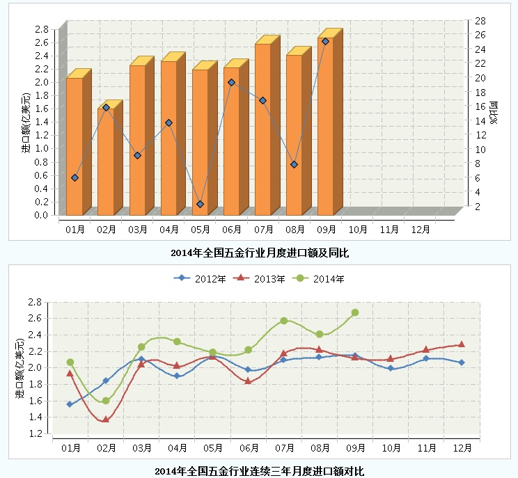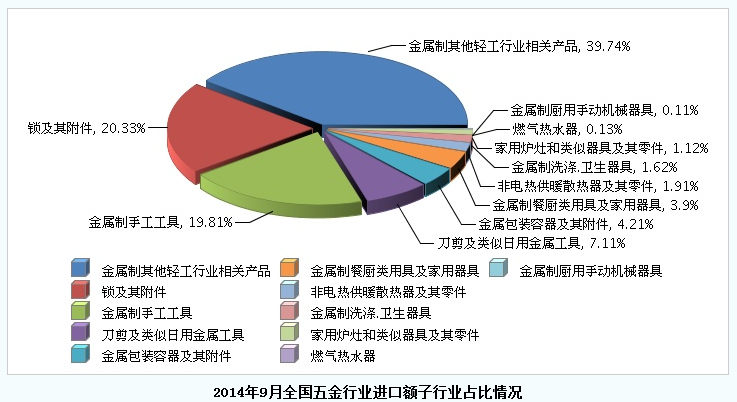 9月份,五金各子行業中,鎖及其附件、金屬制手工工具兩個行業完成進口額相對較多,占比均在20%左右,其完成進口額分別為0.54億美元和0.53億美元。全行業中,金屬制廚用手動機械器具行業完成進口額同比增長最多,超過了170%;此外,除家用爐灶和類似器具及零件、燃氣熱水器兩個行業出現了14%左右的負增長外,其他子行業均實現了10%以上的增長。