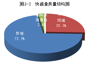 1-9月份,同城、異地、國際及港澳臺快遞業務收入分別占全部快遞收入的12.6%、55.3%和16%;業務量分別占全部快遞業務量的25.3%、72.3%和2.4%。與去年同期相比,同城快遞業務收入的比重上升1個百分點,異地快遞業務收入的比重下降1.6個百分點,國際及港澳臺業務收入的比重下降了3.6個百分點。