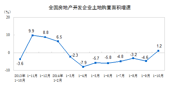 1-10月份,房地產(chǎn)開(kāi)發(fā)企業(yè)土地購(gòu)置面積26972萬(wàn)平方米,同比增長(zhǎng)1.2%,1-9月份為下降4.6%;土地成交價(jià)款7747億元,增長(zhǎng)20.4%,增速提高8.9個(gè)百分點(diǎn)。