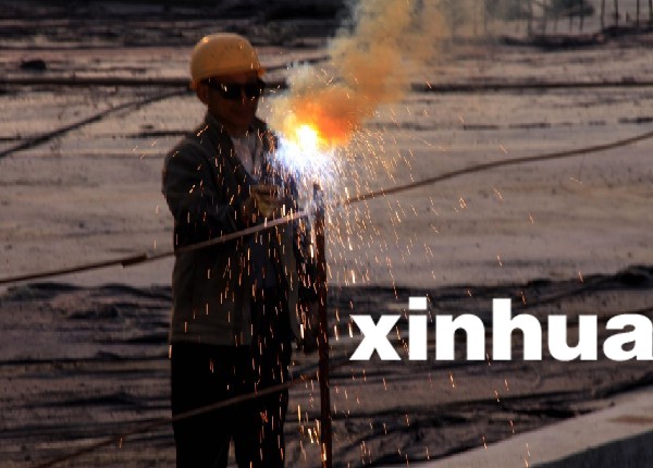 圖為工人正在加緊施工