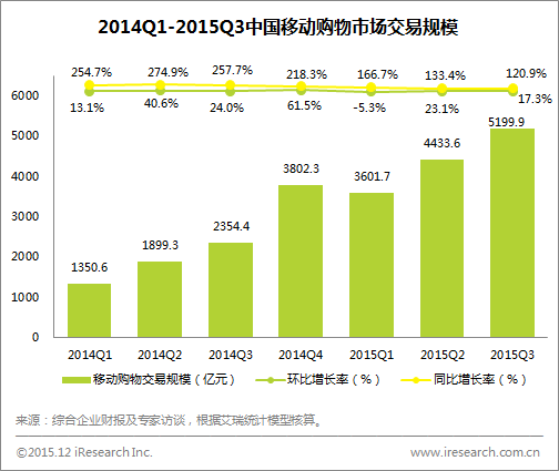 艾瑞咨詢最新數(shù)據(jù)顯示,2015Q3,中國移動(dòng)購物市場交易規(guī)模超過5199.9億元,同比增長120.9%,增速遠(yuǎn)高于中國網(wǎng)絡(luò)購物整體增速。
