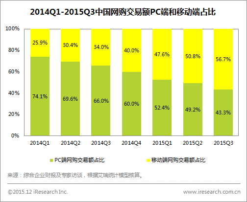 2015Q3移動(dòng)端交易額占網(wǎng)絡(luò)購物總體的56.7%,移動(dòng)滲透率持續(xù)提升