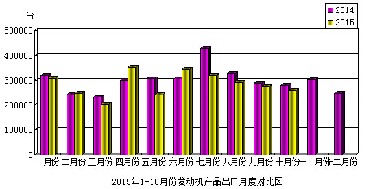 2015年10月份,發動機產品出口25.97萬臺,比去年同期下降了7.43%;出口金額1.72億美元,比去年同期增長了21.60%。