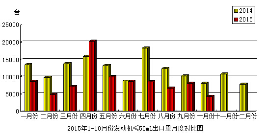 2015年10月份,摩托車發動機(排量≤50mL)產品出口0.43萬臺,比去年同期下降了46.59%;出口金額0.01億美元,與去年同期下降了55.95%。