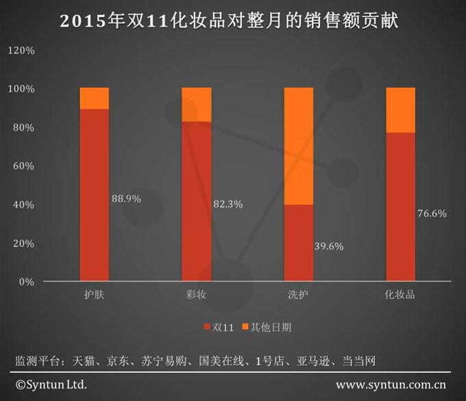 對于11月線上化妝品銷售額的暴漲,雙十一單日的貢獻便達到76.6%。彩妝、護膚產(chǎn)品雙十一當天的銷售額甚至均占據(jù)了整月的80%以上?梢11月線上化妝品的盛世繁榮,幾乎全部得益于雙十一。