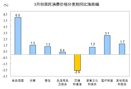 3月份,其他七大類價(jià)格同比六漲一降。其中,醫(yī)療保健、其他用品和服務(wù)、衣著、居住、教育文化和娛樂(lè)、生活用品及服務(wù)價(jià)格分別上漲3.1%、1.7%、1.5%、1.3%、1.2%、0.4%;交通和通信價(jià)格下降2.6%。