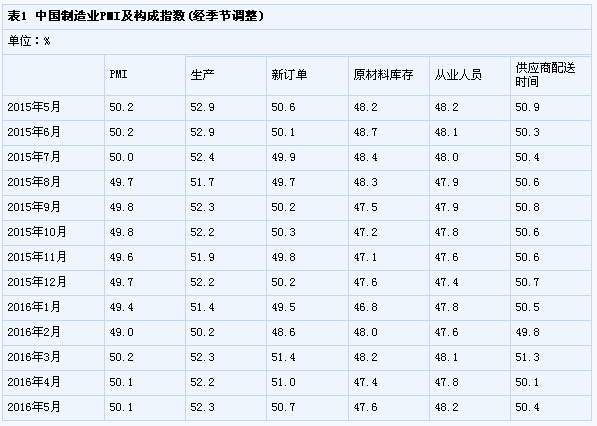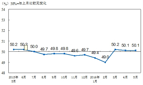 2016年5月份,中國制造業采購經理指數PMI為50.1%,與上月持平,連續三個月位于擴張區間。