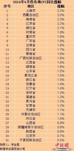在31個省份中,上海6月份CPI漲幅全國最高,為3.2%。數據顯示,上海CPI漲幅自今年3月份開始已連續4個月處于“3時代”。