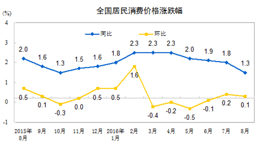 核心提示:國家統計局今日公布數據顯示,2016年8月份,全國居民消費價格總水平同比上漲1.3%,創下今年以來的新低。其中,城市上漲1.4%,農村上漲1.0%;食品價格上漲1.3%,國家統計局今日公布數據顯示,2016年8月份,全國居民消費價格總水平同比上漲1.3%,創下今年以來的新低。其中,城市上漲1.4%,農村上漲1.0%;食品價格上漲1.3%,非食品價格上漲1.4%;消費品價格上漲0.9%,服務價格上漲2.1%。