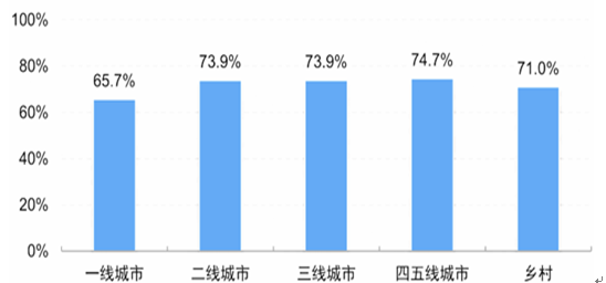 通過對不同地區手機網民的手機安全軟件使用率進行分析可以發現,城市發展水平越高,其手機安全軟件的使用率反而越低。這很大程度上是由于經濟發達城市的用戶 iOS 系統占比較高,而這部分用戶對于手機安全軟件需求不強造成的。數據顯示,一線城市的手機安全軟件使用率最低,為 65.7%;四五線城市的手機安全軟件使用率最高,達到 74.7%。此外,手機安全軟件在農村的使用率也達到 71%。