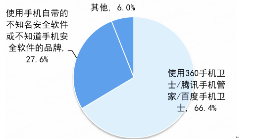 通過對手機安全軟件用戶進行調查發現,用戶使用的手機安全軟件品牌主要集中于 360手機衛士、騰訊手機管家和百度手機衛士三家,其用戶首選率之和達到 66.4%,市場集中度較高。此外,由于很多用戶缺乏對手機安全軟件品牌的分辨能力,27.6%的用戶使用手機自帶的不知名安全軟件或不能分辨手機安全軟件的品牌。