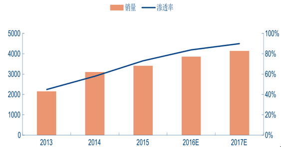 2017年互聯網電視有效用戶量將正式過億,規模效應將大大改觀。根據現有的電視機銷量及互聯網電視滲透率,預計 2017 年行業將新增約 3500~4000 萬激活用戶,互聯網電視有效用戶量將正式過億,存量滲透率突破 20%。考慮到互聯網電視內容更加高的活躍率與觀看時長,其產生的用戶流量占比將超過 30%,成為電視產業所不可或缺的核心分發渠道,規模效應將大大改觀。