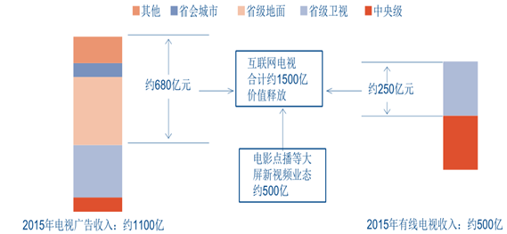 廣告與視頻付費是變現主力,視頻生態即將率先迎來近千億市場價值的轉移和釋放。從傳統電視產業鏈轉移過來的價值包括 1)傳統電視廣告的轉移:據估算,2015 年廣電體系的電視廣告規模接近 1100 億元,其中中央級電視臺、省級衛視的內容與收視率競爭力依然較強,而省級地面電視臺、省會城市及其他地市級電視臺的競爭力持續下降,該部分占比達到 62%,也即有 680 億元的廣告價值將開始以開機廣告、視頻貼片廣告的形式向互聯網電視轉移。2)傳統有線電視收視費的轉移:2015年,有線電視收視費規模超過 500 億元,假設中期有一半向互聯網電視轉移,對應約 250億市場價值。