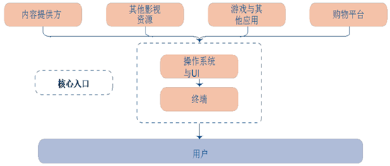 互聯網電視時代,智能電視終端將成為連接內容與用戶的核心入口,內容分發的唯一渠道。信息消費領域,渠道的價值在于能夠給內容帶來流量。傳統電視時代,有線電視體系承擔了將信號傳輸到用戶端的作用,因此除了向用戶收取的基礎收視費用外,電視臺還需要向有線體系支付落地費,北美付費頻道的訂閱費電視臺甚至需要與有線網絡五五分成。互聯網電視時代,用戶將通過終端直接觀看內容,因此負責用戶運營,并整合內容資源的終端系統就成為了新時代下的流量入口以及內容分發渠道。