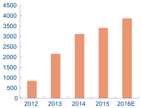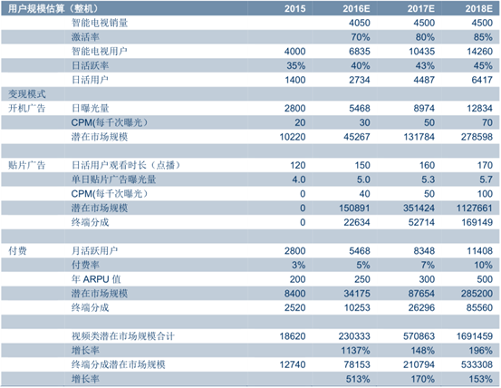 電視機存量 VS 有效用戶數量,用戶規模尚未到質變拐點。重新定義互聯網電視行業有效用戶數量這一概念:現有的互聯網電視存量中,存在一定的低內存(小于等于 1G)、弱系統的電視機,無論是推送新內容與廣告的能力(部分無法播放視頻廣告)或是變現手段的完善(無法升級掃碼支付等)都遠低于后期銷售的互聯網電視。因此行業真正具備運營價值的互聯網電視用戶要低于已銷售的存量,預計 2016 年底,行業有效用戶量在 6000~7000 萬臺左右。與中國 5億電視機存量相比,滲透率剛過 10%,尚未達到質變拐點。