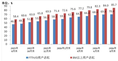 2015-2016年8月光纖接入FTTH/O和8Mbps及以上寬帶用戶占比情況