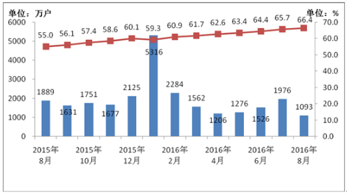 2015-2016年8月移動寬帶用戶當月凈增數(shù)和總數(shù)占比情況
