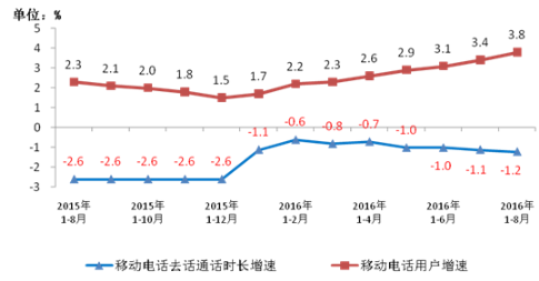 2015-2016年8月移動電話用戶和通話量增幅
