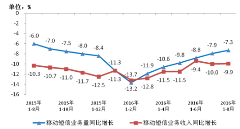2015-2016年8月移動短信業(yè)務量和收入同比增長情況