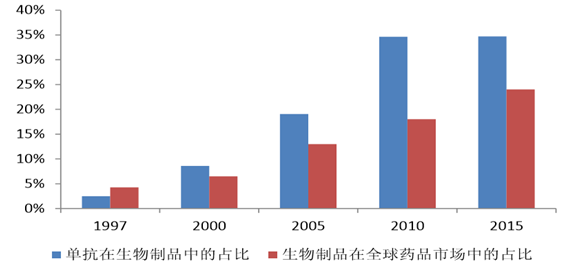 經(jīng)過(guò)多年的高速發(fā)展,單抗在全球生物制品行業(yè)中的市場(chǎng)占比已由 1997 年 2.5%上升到 2015 年的 34.7%,成為全球生物制品行業(yè)中市場(chǎng)占比最大的子行業(yè)。與此同時(shí),在單抗制 品的帶動(dòng)下,生物制品在全球藥品市場(chǎng)中的占比也逐年攀升。