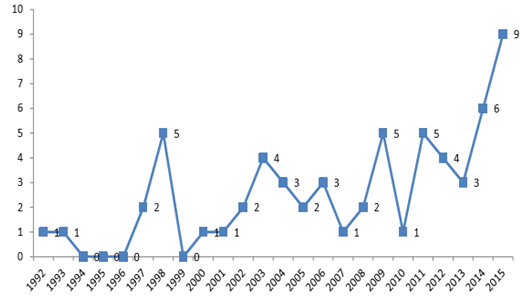 1992-2015 年國(guó)外年度批準(zhǔn)的原研抗體藥物數(shù)目