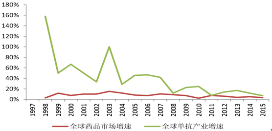 1997-2015 年全球單抗產(chǎn)業(yè)市場(chǎng)增速與全球醫(yī)藥行業(yè)增速對(duì)比