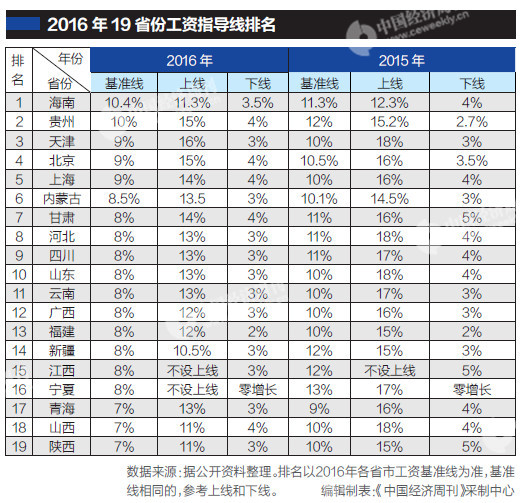 《中國經濟周刊》記者統計發現,今年7月之前,僅有天津、北京、山東、山西、內蒙古等5省份發布了2016年工資指導線。從8月至今,海南、河北、四川等其他14個省份陸續發布。但是,截至記者發稿,依然有一些省份未發布今年的工資指導線。