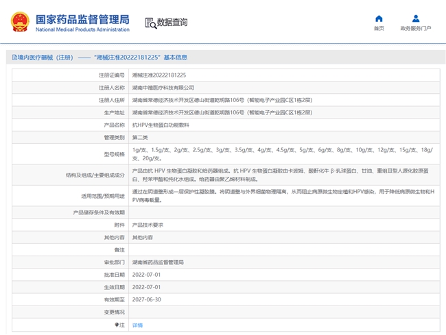 衛茵清抗HPV生物蛋白功能敷料,它就是通過國家藥品監督管理局的嚴格審批,獲得了上市許可的國家二類醫療器械。它的注冊證編號為:湘械注準20222181225。