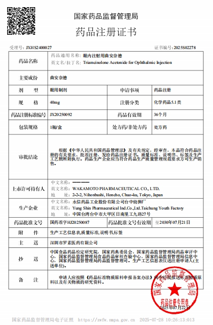 核心提示:這款藥物標志著我國眼科治療領域的突破,成為國內“玻璃體手術中玻璃體可視化”技術的創新藥物,且不含任何防腐劑和賦形劑。2025年7月,深圳羅素醫藥有限公司與日本百年藥企Wakamoto株式會社的戰略合作取得里程碑式進展!雙方攜手合作的眼內注射用曲安奈德(OphTA)(商品名:羅利明®)喜獲中國國家藥品監督管理局批準,正式上市!