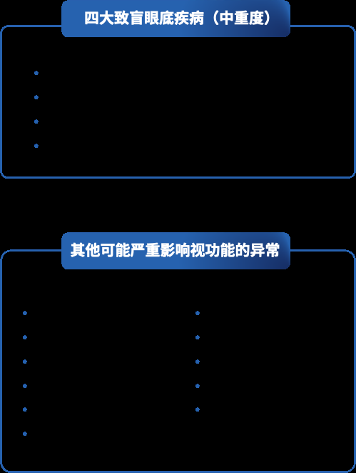 《藍皮書》共檢出致盲性疾病58,088人次,檢出率為1.1%,占整體異常比例的1.4%。在全球五大致盲性疾病中(白內障、青光眼、病理性近視、糖尿病視網膜病變、年齡相關性黃斑變性),除白內障之外,其余四種均發生于視網膜上,視網膜疾病通常進展緩慢,不易察覺,但對視力威脅極大,因此定期的視網膜健康評估是防治視網膜疾病的有效手段①。