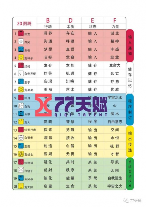 77天賦,就是從卓爾金歷里,將20個圖騰和13個調性所組成的260個不同組合(也叫KIN,每個組合都包含五個圖騰和相應調性所生成的五大神諭力量),對應每個人出生日宇宙和地球母親的磁場,解讀每個人與生俱來的天賦才華,簡單易學,深入人心。