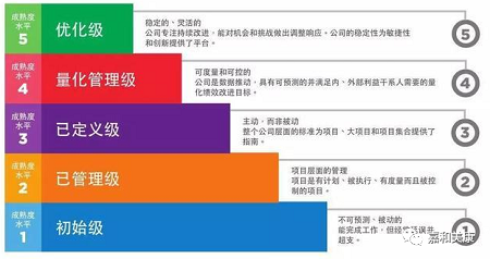 CMMI成熟度水平分為5個等級,其中,CMMI五級為該體系最高等級評估,是目前國際軟件行業對管理成熟度要求最高、申請難度最大、級別最高的評估,同時也是企業在軟件研發標準化、規范化、成熟度等方面的最高認證。