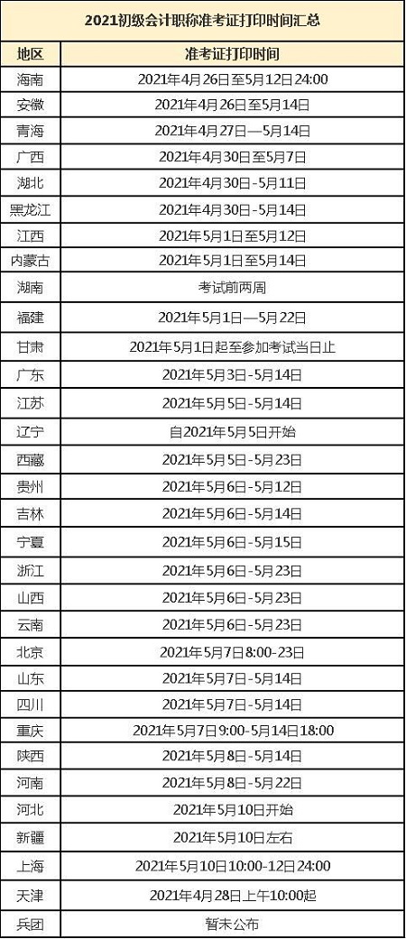 五一之前,2021年初級(jí)會(huì)計(jì)準(zhǔn)考證打印入口就已經(jīng)正式開(kāi)通了,截止到目前,可以打印準(zhǔn)考證的省市有北京、天津、山西、遼寧、內(nèi)蒙古、吉林、黑龍江、江蘇、浙江、安徽、福建、江西、山東、湖北、湖南、廣東、廣西、海南、四川、重慶、貴州、云南、西藏、甘肅、陜西、青海、寧夏,其他省市的準(zhǔn)考證打印入口也在陸續(xù)開(kāi)放中。各省市具體準(zhǔn)考證打印時(shí)間匯總?cè)缦?