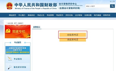 1、登錄財(cái)政部會(huì)計(jì)資格評(píng)價(jià)中心(選擇帶官網(wǎng)后綴的搜索項(xiàng)),在網(wǎng)站首頁(yè)左側(cè)找到“考生服務(wù)”-“準(zhǔn)考證打印”,點(diǎn)擊進(jìn)入;