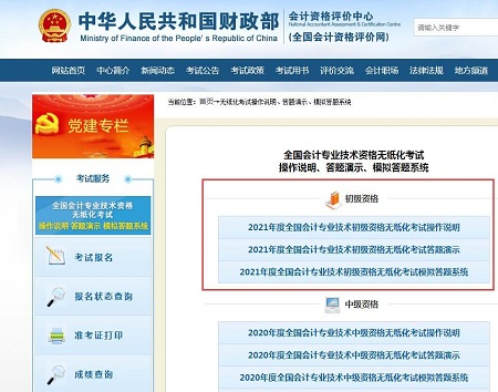 1、登錄財(cái)政部會(huì)計(jì)資格評(píng)價(jià)中心官網(wǎng),在首頁(yè)找到漂浮窗“全國(guó)會(huì)計(jì)專業(yè)技術(shù)資格無(wú)紙化考試操作說(shuō)明、答題演示、模擬答題系統(tǒng)”,點(diǎn)擊進(jìn)入。